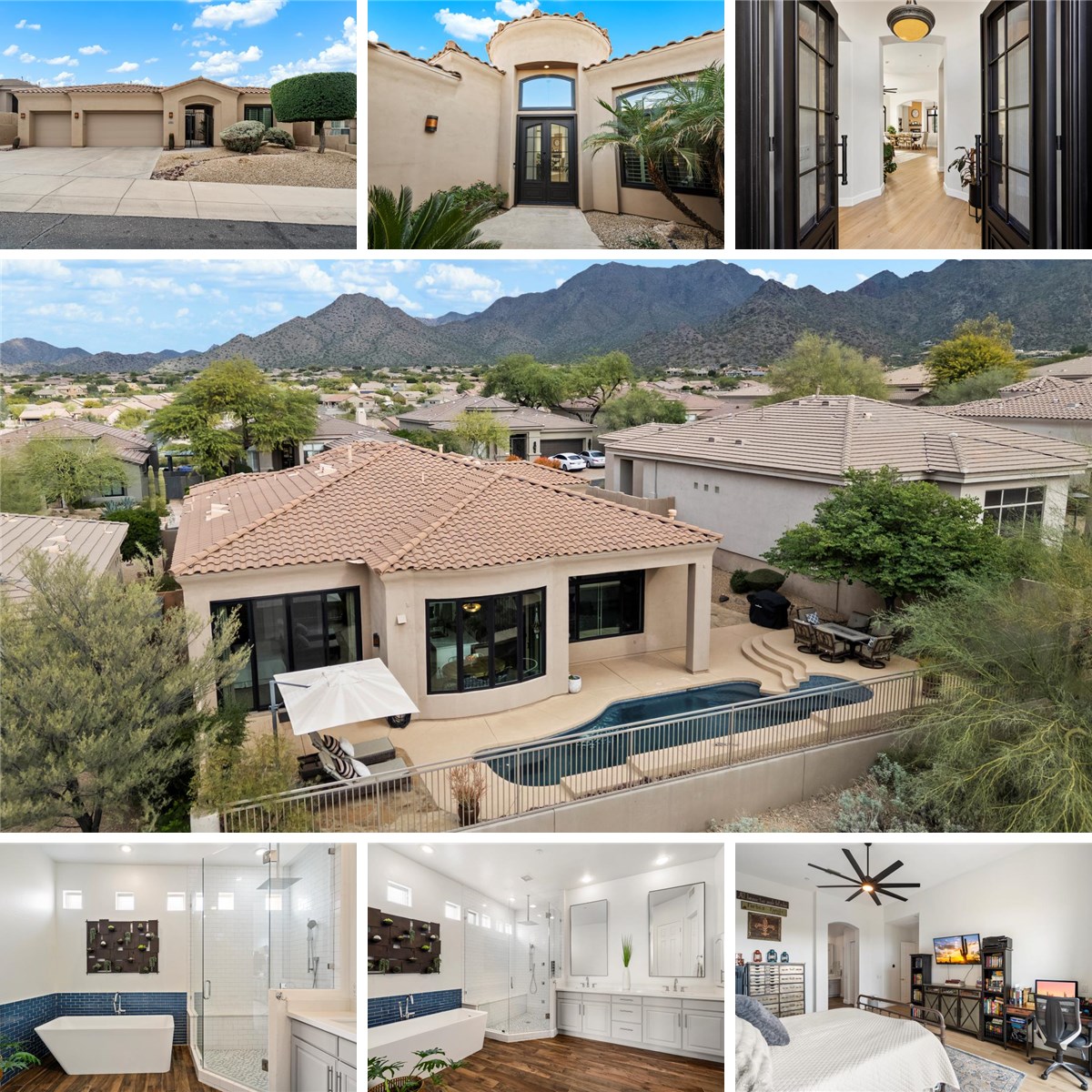 Welcome to 10747 Greenway Road-perched in the guard-gated community of Cimarron Hills in McDowell Mountain Ranch. An elegant Toll Brothers single level floor plan offers 3 bedrooms in the main home plus a private guest casita. The third bedroom does not currently have a built-in closet but features a versatile wardrobe system. Updated and turn key highly cared for features new Andersen windows throughout, an abundance of natural light, creating a bright and serves all particular buyers checklist. The primary suite overlooks the pool, sitting area, and serene desert views and features a beautifully remodeled spa-like bathroom with a pedestal soaking tub, expansive glass-enclosed shower, dual vanities, private water closet, and walk-in closet. The second bedroom is an en-suite with a walk