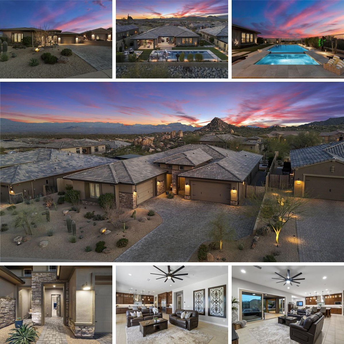 Located in the exclusive, gated Storyrock community of North Scottsdale, this exceptional single-story luxury home captures some of the most expansive and panoramic views in the area, including Four Peaks, Tom’s Thumb, Weaver’s Needle, the McDowell Mountains, and surrounding desert preserves. Situated on a private, south-facing 1/3-acre homesite with extensive view fencing and lush greenbelts, the setting is both peaceful and dramatic. Spanning approximately 3,478 sq. ft., this move-in-ready residence features 4 bedrooms plus a flex room, 4.5 baths, and a 4+ car garage, built on the highly desirable Taylor Morrison Windom plan with upgraded Owner’s Suite Extension and optional second Outdoor Living area. Inside, the upgraded gourmet Chef’s Kitchen impresses with a full GE Monogram appliance suite, 48” gas cooktop, double ovens with smart technology, oversized 10’x10’ island, pot filler, stacked maple cabinetry with lighting, large walk-in pantry, cocktail/bar area, and adjacent morning kitchen. Designer finishes throughout include Fantasy Brown countertops, matte black fixtures, upgraded flooring, Polywood shutters, Smart Home features, built-in TV mounts, and abundant storage. The extended Owner’s Suite offers a true retreat with a spa-inspired bath featuring a freestanding soaking tub, oversized walk-in shower, custom tilework, and premium cabinetry. All bedrooms include en suite baths, while the versatile flex room adds privacy and functionality. Three sets of stacked glass sliding doors open to both covered Outdoor Living areas with travertine flooring to enjoy indoor/outdoor living from both the living and dining areas. The resort-style backyard is designed for year-round enjoyment with a custom heated pool and oversized spa, raised view patio, electric sun shade, bocce court, citrus trees, low-maintenance desert landscaping, smart irrigation, ambient lighting, and multiple gated access points. With insulated garages, EV charging, and impeccable upgrades throughout, this home offers luxury desert living at its finest in one of Storyrock’s premier view locations.