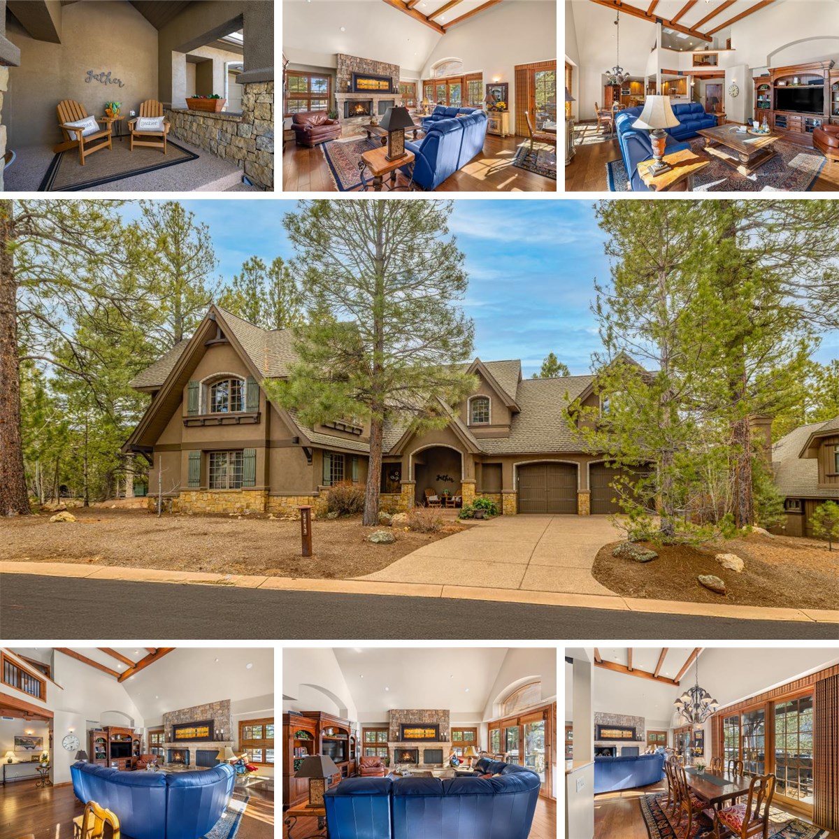 Cozy cabin located within the Creekside neighborhood of Pine Canyon. Private guard gated golf community in Flagstaff offers four season living, golf, ski and endless recreation! The exceptional luxury residence provides main level living with primary suite and all living space on the main level, wrap around patio, tall pines surrounding the home and built in entertaining area including bbq. The open kitchen overlooks the great room for all season enjoyment, soaring ceilings, gas log fireplace, stone surround, ample natural light, hardwood floors, alder cabinets and doors, exceptional quality and finishes throughout. Upstairs is an additional primary and two additional bedrooms. Well cared for truly a great value for Pine Canyon.
