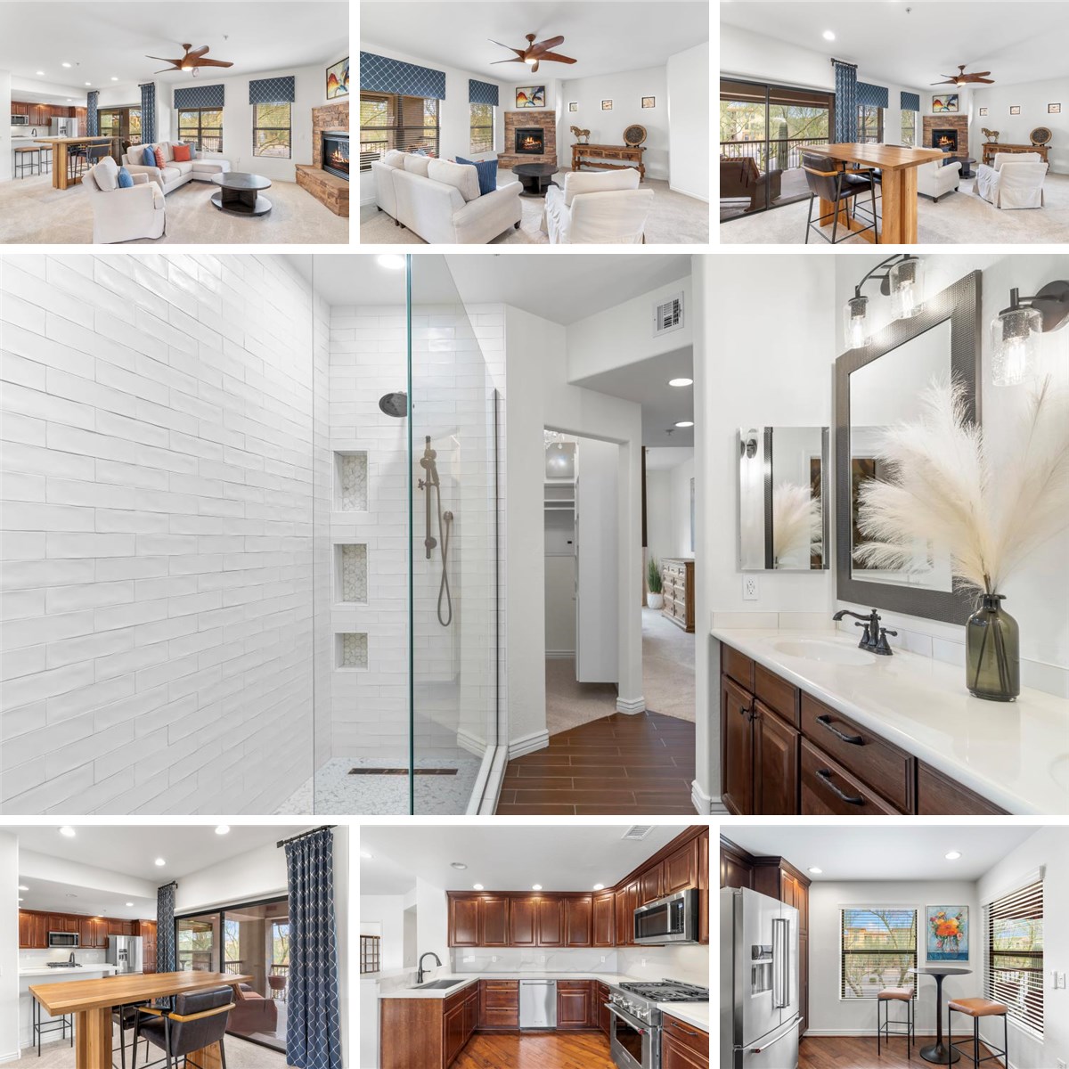 Meticulously maintained with everything in like new condition. Beautifully remodeled with high-end finishes throughout. Spacious great room floor plan with 2 Bedrooms, Den/Office, Gas Fireplace and 2 Bathrooms. Chef's kitchen features Calacatta Quartz countertop and backsplash, upgraded cabinets with rollout shelving, KitchenAid Stainless Steel appliances, 36'' French Door Refrigerator, Ruvati Stainless Steel sink, dishwasher w/fan-enabled pro dry system and print shield finish, 30'' 4 burner convection oven freestanding gas range, and over the range microwave. The luxurious primary suite is complemented by a walk-in closet designed by California Closets, custom tile walk-in shower w/glass enclosure, dual vanities and custom mirrors.