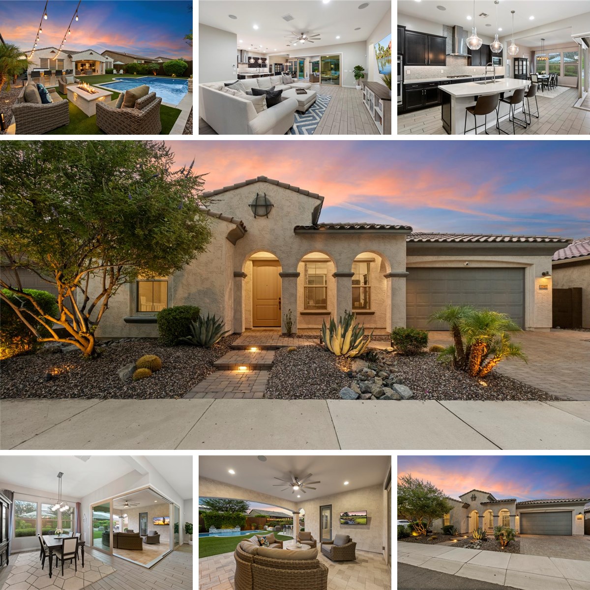 Discover modern elegance in this 2019 single story home, perfectly situated in the highly sought after gated community of Astarea at Sky Crossing in North Phoenix. This residence offers three bedrooms, two and a half baths, a spacious office, and an open concept design that blends style, comfort, and sophistication. The heart of the home features a stunning great room with tile flooring, built-in surround sound, and a gourmet kitchen complete with a gas cooktop, double ovens, built-in microwave, stainless steel appliances, and a large island, perfect for entertaining. The show stopping corner-less sliding glass door opens to a resort style backyard, seamlessly merging indoor and outdoor living. Step outside to your private oasis featuring a sparkling pool, relaxing spa, sheer descent waterfall, an oversized covered patio with misting system, travertine pavers, low maintenance turf, an outdoor kitchen and a cozy fire pit, perfect for year round gatherings and relaxation. Inside, a charming interior courtyard adds warmth and natural light, while the luxurious primary suite impresses with a zero entry shower, dual vanities and an expansive walk-in closet. Residents of Sky Crossing enjoy unmatched amenities including two recreation centers with pools (Astarea's has lap lanes), fitness facility, a private clubhouse with billiards and foosball, event lawns, basketball court, playgrounds and engaging social activities for all ages. Conveniently located near premier shopping, dining, and freeway access, this home offers the perfect balance of modern design, comfort, and community.