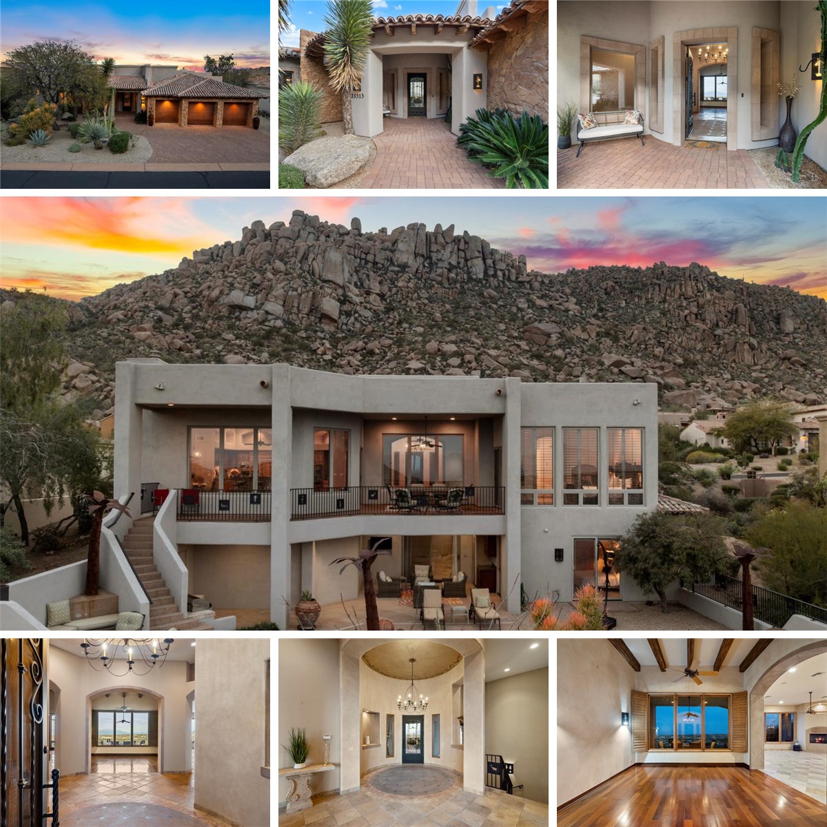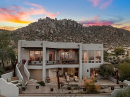 Perched at the base of Troon Mountain in the prestigious Troon Village at Windy Walk community, this exceptional 4,271-square-foot residence captures sweeping, unobstructed views of Four Peaks and the McDowell Mountains, with panoramic desert vistas stretching nearly 40 miles. Designed for effortless single-level living, the main floor offers step-free access from both the front entrance and the three-car garage and features an open-concept layout that seamlessly connects the kitchen, formal living room, family room, and breakfast nook — all thoughtfully positioned to maximize natural light and breathtaking scenery. The primary suite and a secondary bedroom are located on the main level, along with a full laundry room and powder bath. In total, the home offers four bedrooms and four-and-a-half bathrooms, providing generous space for both everyday living and entertaining. The expansive walkout lower level serves as a private guest retreat, ideal for visitors or multi-generational living, complete with a kitchenette that can easily be expanded into a full kitchen. Old World–inspired beveled travertine stone adds timeless character, while two spacious family rooms and three fireplaces create warm, inviting gathering spaces. Outdoors, enjoy a pool with water features, an outdoor fireplace, built-in BBQ, and a beautifully designed sitting area with custom cabinetry — all perfectly positioned to capture Arizona’s dramatic sunsets and mountain views. With quality construction, a three-car garage, and epic desert vistas in one of North Scottsdale’s most coveted settings, this home delivers refined Arizona luxury at its finest