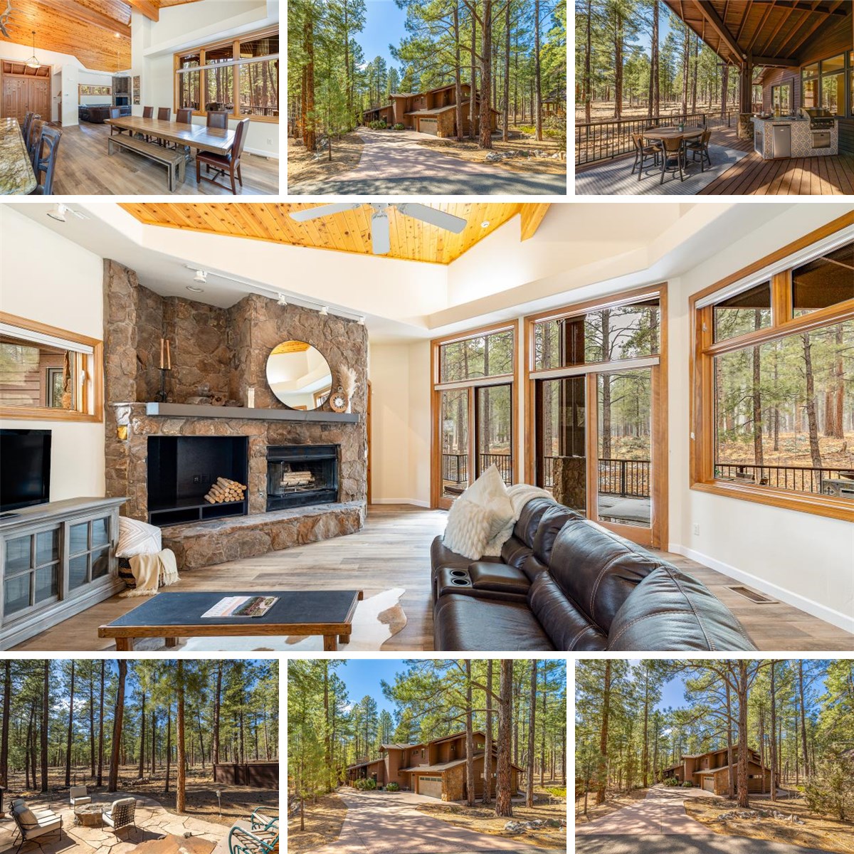 Nestled within the exclusive Forest Highlands community, this stunning five bedroom, six bathroom residence offers the perfect combination of cozy mountain luxury surrounded by national forest. Designed with meticulous attention to detail, the home features expansive living spaces, soaring ceilings, and an abundance of natural light that highlights each living space with large glass windows and skylights. The eat in kitchen features custom cabinetry, stone countertops, wet bar with wine refrigerator and a spacious island perfect for entertaining. A grand great room with a malepai stone wood burning fireplace serves as the center of the home, seamlessly connecting to a formal dining area and panoramic pines.