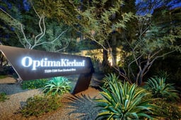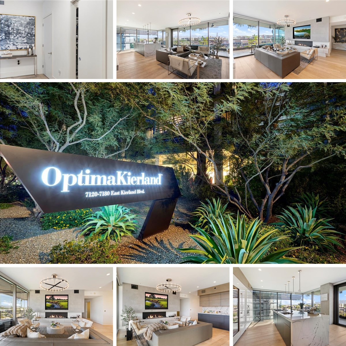 Experience elevated living in this sophisticated turn-key residence at Optima Kierland in the Scottsdale Quarter. This designer-styled 2-bedroom, 2-bath end unit exudes modern luxury, featuring a 72'' floating gas fireplace and custom entertainers wet bar with icemaker and champagne sink. The chef's kitchen dazzles with a quartzite Calacatta island, Sub-Zero refrigeration and bottom freezer, dual subzero wine coolers, Gaggenau oven/microwave and a discreet Wolf hood seamless integrated.. The primary suite offers a serene retreat with custom California Closets, dual vanities, spa shower, and dedicated home office with custom cabinetry. Wide-plank wood floors, motorized shades t/o, and mountain-view covered patio complete this architecturally elegant home. This unit comes with 2 garage spots