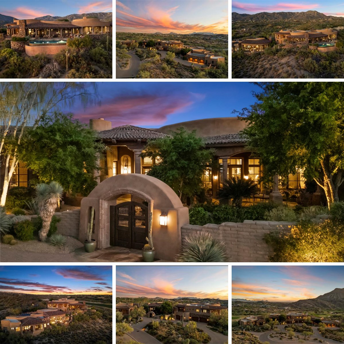 With Available Golf Membership: Experience luxurious desert living in this stunning Southwestern architectural masterpiece by renowned designer Lee Hutchinson. This exceptional estate features a flowing, organic Pueblo design, harmonizing seamlessly with the natural desert landscape. Encompassing an impressive 9,085 sq. ft., the main residence, built by Shiloh Homes, offers five spacious en-suite bedrooms. A hallmark of southwestern elegance, the home boasts six fireplaces, creating warm, inviting spaces throughout. Multiple living areas, expansive covered patios (totaling 4,000 sq. ft.), and sweeping views provide a blend of comfort and grandeur.